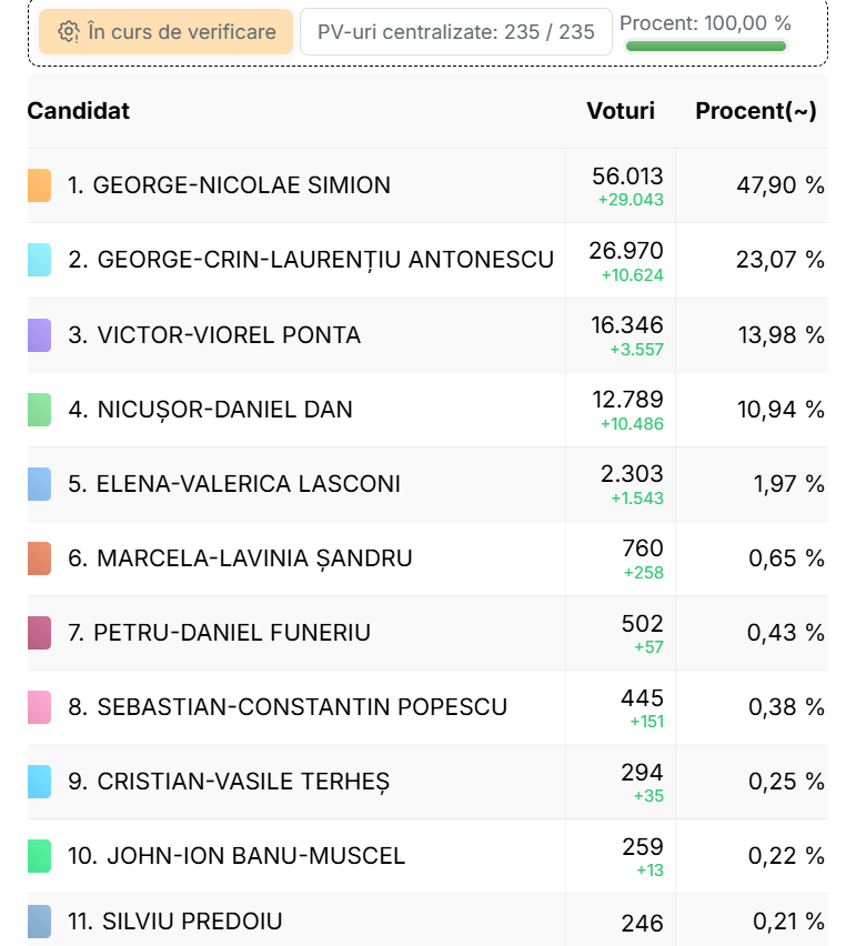 La momentul publicării acestui material, Nicușor Dan are un avans de 4.972 de voturi față de Crin Antonescu. Pe primul loc se menține George Simion, la o diferență de peste 1,7 milioane de voturi față de locul doi.